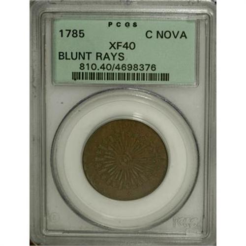 <B>1785 COPPER Nova Constellatio Copper, Blunt Rays XF40 PCGS.</B></I> Crosby 1-B, High R.3. A late die state with crumbling on the lower obverse and a heavy break on the base of the wreath. A maroon-brown piece with bold devices and moderate reverse granularity. In a green label holder. Listed on page 52 of the 2008 <I>Guide Book</B></I>. Population: 5 in 40, 14 finer (1/08).<BR><BR><b>Shipping:</b> Coins & Currency (<a target="_blank" href="http://www.heritageauctions.com/common/shipping.php">view shipping information</a>)