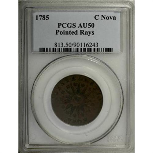 <B>1785 COPPER Nova Constellatio Copper, Pointed Rays AU50 PCGS.</B></I> Crosby 4-D, R.4. The obverse is chocolate-brown to medium brown, and the reverse is walnut-brown with ice-blue undertones. A lightly circulated but pleasing representative of this Robert Morris series. Listed on page 52 of the 2008 <I>Guide Book.</B></I><BR><BR><b>Shipping:</b> Coins & Currency (<a target="_blank" href="http://www.heritageauctions.com/common/shipping.php">view shipping information</a>)