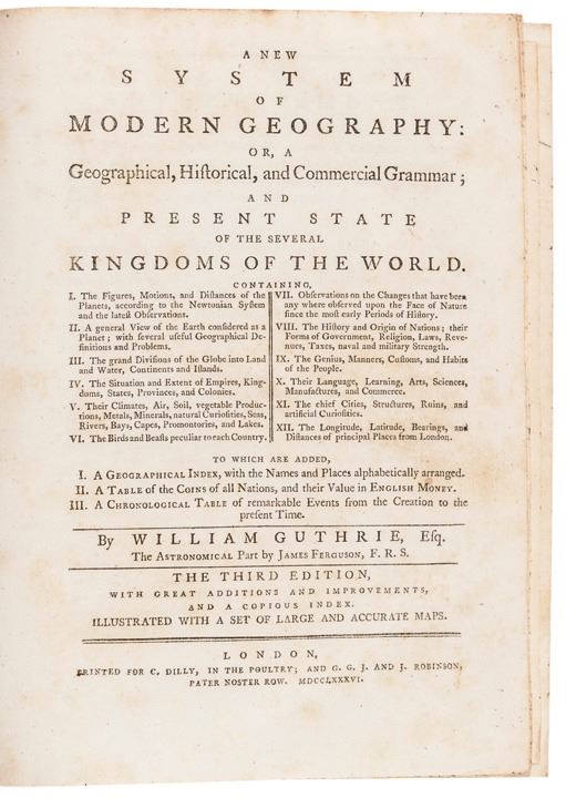 1786-Dated Book titled: “A New System of Modern Geography,” by William Guthrie. Third Edition, in 2 Volumes, London, Choice Crisp Near Mint.