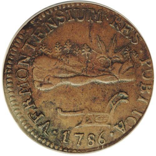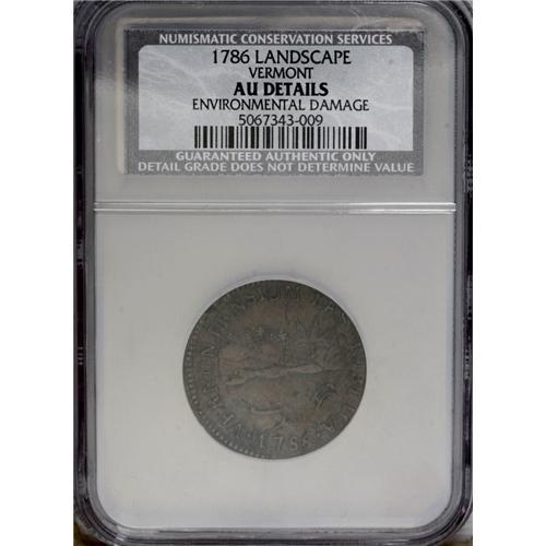 <B>1786<COPPER> Vermont Copper, VERMONTENSIUM--Environmental Damage--NCS. AU Details.</B></I> RR-8, Bressett 6-E, Low R.4. By a small margin the scarcest of three Vermont Landscape die pairings, most easily identified by a boldly repunched 1 in the date. While struck a few degrees off-center toward 2 o'clock and showing a few minor planchet irregularities, the environmental damage qualifier appear to stem from light, possibly removable verdigris about the devices. All in all, a more than acceptable example of this popular Colonial. Listed on page 68 of the 2006 <I>Guide Book.</B></I> <BR><BR><B>Important notice:</B> Heritage usually auctions material at the rate of 200-250 lots per hour. On some occasions eBay Live bid software or the Internet may not be able to keep up with the pace of the auction. We recommend placing a realistic absentee bid now as insurance to avoid disappointment. Occasionally the auctioneer may eliminate or reject an eBay Live bid, and the auctioneer may also reopen a lot after the close of the eBay live bidding (usually because we missed an audience bid), and may reject your bid even if it shows you as the winning bidder. By bidding via eBay Live, you agree that Heritage may award the lot to another bidder at its sole discretion under the circumstances described above or any other reasonable circumstances. Since eBay bids are not shown to us until we open the lot on the floor, we treat those bids just like floor bids. In most cases the floor responds before the eBay bid is presented to us, due to Internet lag time, so for consistency we have made it a policy that floor bids are always considered first over tie eBay live bids. Also please note that all Heritage lots purchased through eBay Live carry a 20% Buyer's Premium. Please make sure you read the Terms and Conditions before you bid. This lot is being auctioned in conjunction with a live floor auction by Heritage Galleries & Auctioneers. All final auction and invoice information will be supplied by Heritage Galleries & Auctioneers, and all other information should be considered preliminary. Lot:156 <BR><BR><B>Winning Notification and Billing:</B> After the FINAL session in this auction is complete, Heritage will send e-mail and snail mail invoices. This process normally takes several days. All final auction and invoice information will be supplied by Heritage Galleries & Auctioneers, and all other information should be considered preliminary. <BR><BR>This auction will be conducted on a live auction floor and over the Internet through eBay Live. If you choose to place an absentee bid, please take a moment to <font color='#0000ff'><u><a href='http://pages.ebay.com/liveauctions/help/before/laabsentee.html'>learn how eBay Live absentee bidding works</a></u></font><font color='#000000'>
