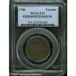 <B>1786 COPPER  Vermont Copper, VERMONTENSIUM Fine 12 PCGS.</B></I> RR-6, Bressett 4-D, R.2. The floating fourth pine tree identifies this popular Landscape variety. Somewhat porous, however, the rising sun, trees, and all-seeing eye have pleasing definition. The reverse is several degrees off center, affecting the tops of QUARTA. Listed on page 57 of the 2005 <I>Guide Book.</B></I>    Lot:5032