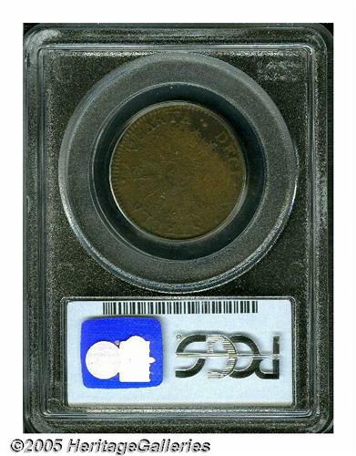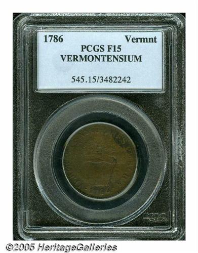 <B>1786<COPPER> Vermont Copper, VERMONTENSIUM Fine 15 PCGS.</B></I> RR-7, Bressett 5-E, R.3. Tan-brown color fills the centers; the borders offer deeper mahogany hues. A granular piece with a couple of lesser handling marks northwest of the plow. The date and most other legends are clear, the eye and rising sun retain some definition. Listed on page 57 of the 2005 <I>Guide Book.</B></I>