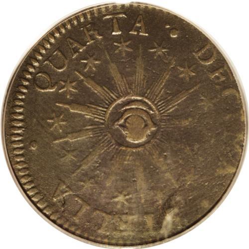 <B>1786<COPPER> Vermont Copper, VERMONTENSIUM VF30 PCGS.</B></I> RR-7, Bressett 5-E, R.3. A mint-made die break weakens the top of the plow, but the landscape is clear as are most of the rays. Granular dark brown surfaces with faint brush marks on the reverse. The obverse is well centered, while the reverse is misaligned several degrees toward 3 o'clock. Listed on page 68 of the 2007 <I>Guide Book.</B></I>