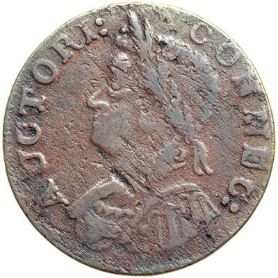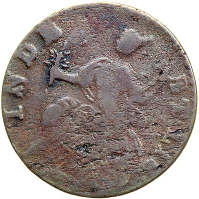 1786 Connecticut Miller 5.7-H.1 R6-. Fine-15. Slightly sharper but fine roughness covers the protected areas on both sides. The microscopic roughness is mixed with some tiny planchet fissures. While the surfaces and planchet are not perfect, they are rather decent for this rare variety. No verdigris or contact marks. Slightly glossy brown and chocolate with darker steel brown toning on the highpoints. The date is only partially visible but the legends are complete. A bit weakly struck on the lower right of the reverse, as usual for the variety. Weight 120.2 grains.