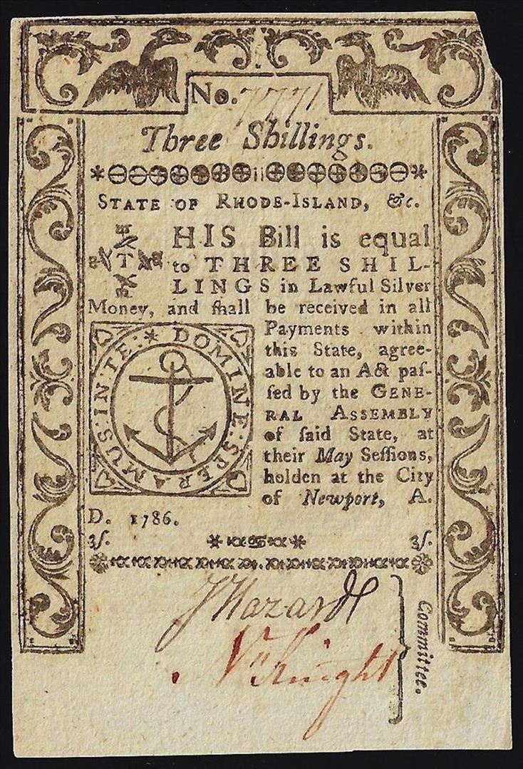 One 1786 Three Shillings Rhode Island Colonial Currency Note.