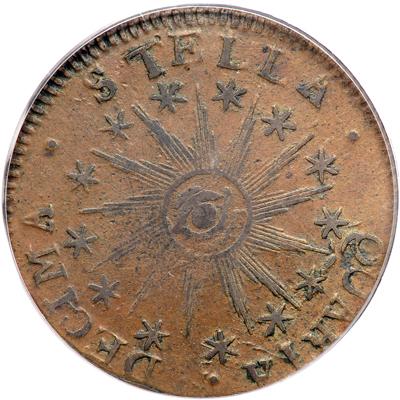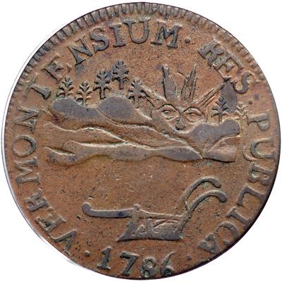 1786 Vermont Landscape Ryder-6 Rarity-2. PCGS graded EF-45. The VERMONTENSIUM type. Choice glossy light chocolate brown with darker chocolate toning on the highpoints. The surfaces are smooth and very attractive, especially for a landscape type Vermont that almost always comes with planchet flaws. The best identifying mark is a small splash of darker chocolate brown toning under the S in RES. Nicely struck early die state, before the die crack up through the date. The obverse is slightly misaligned to K-5 leaving the bottom edge of the 86 and upper edge of the adjacent CA off the planchet, but everything else is complete. You may be able to find examples of the Landscape type graded higher than this piece, but you won't find one with a nicer planchet. This piece is superior to the Carlotto plate coins for the variety in his book on the Vermont coppers. Pop 15; 20 finer.