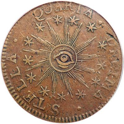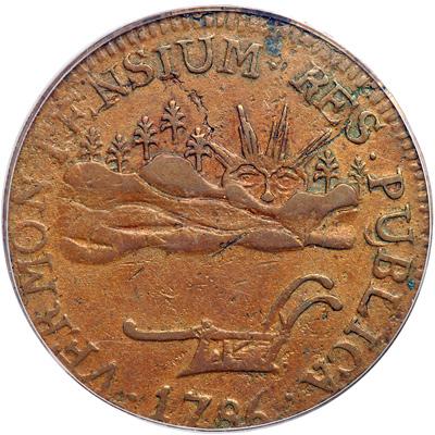 1786 Vermont Ryder-6 R2. VERMONTENSIUM landscape type. PCGS graded EF-45. Glossy light to medium brown with chocolate toning on the highpoints. The planchet is well above average with only a couple trivial planchet voids near the rim. The surfaces are not perfectly smooth but the roughness is microscopic and is limited to the fields. The obverse is struck slightly off center to the bottom leaving the bottom of the date tight to the edge, but the remainder of the legends on both sides are complete and clear. EDS, before the obverse die cracked. A very nice example of this popular Landscape type.