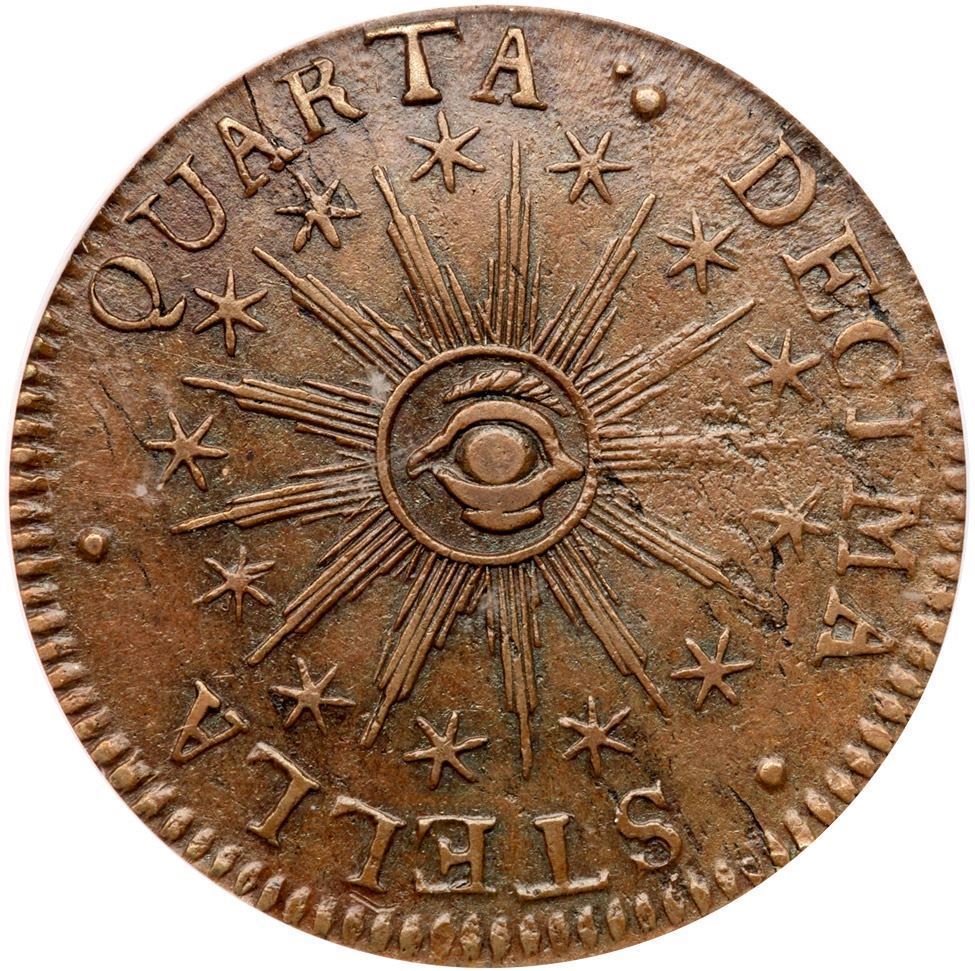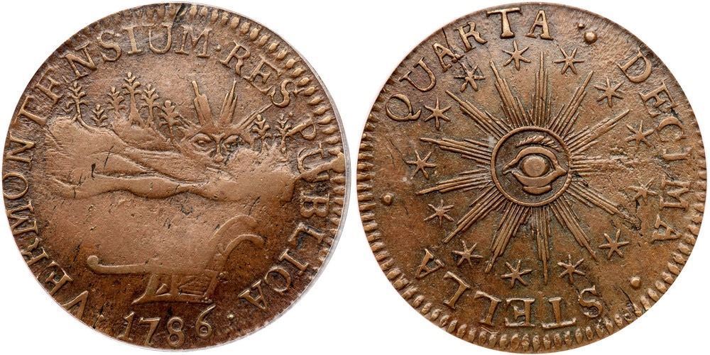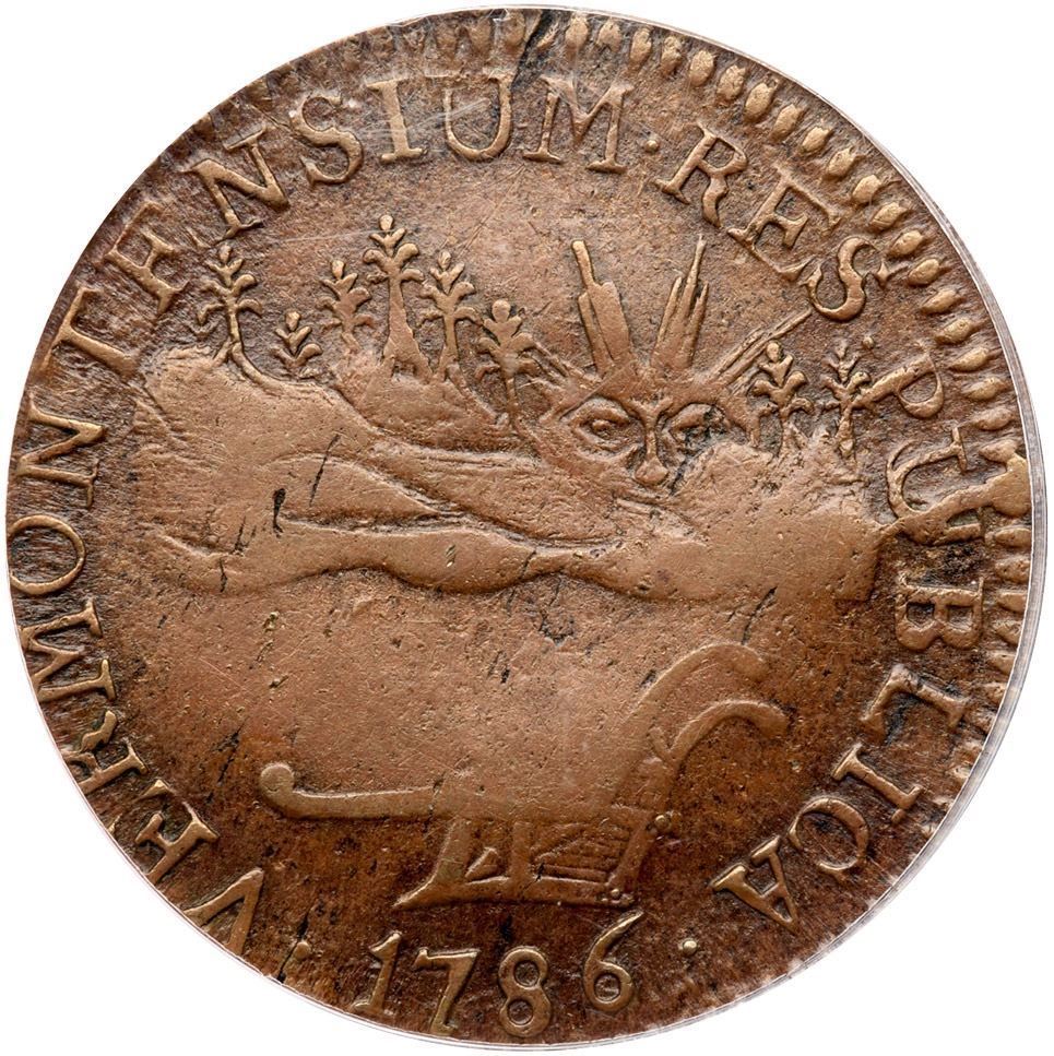 Glossy light to medium brown blending to light chocolate in protected areas. A choice piece for a Landscape Vermont with just a couple trivial planchet flaws. A tiny fissure in the dentils over UM and shallow planchet chipping on the right side of the reverse are the only defects (all as struck). Late die state with strong swelling on the obverse and a very bold die crack through the U in PUBLICA with a small cud on the rim above that letter. A premium example of the variety in a neat die state. Our grade is EF40. Listed on page 56 in the 2023 "Redbook." Housed in an older generation PCGS slab.