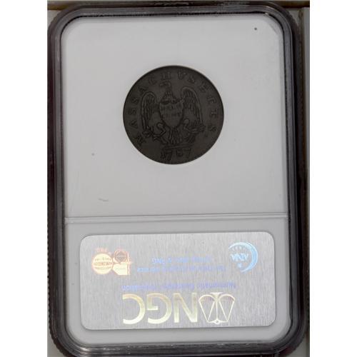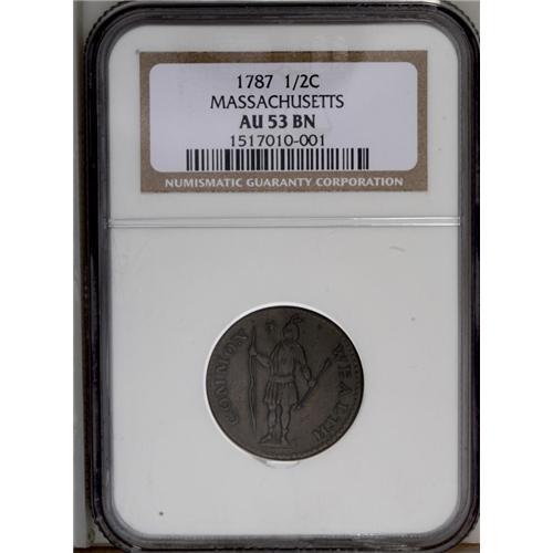 <B>1787<1/2 C> Massachusetts Half Cent AU53 NGC.</B></I> Ryder 2-A, R.3. Period after MASSACHUSETTS. A problem-free chocolate-brown example with moderate rub on the centers. Both sides show some weakness on the denticles. A large die lump (as struck) resides between E and T along the right reverse rim. Abrasions are almost nonexistent. Listed on page 57 of the 2007 <I>Guide Book.</B></I>