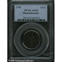 <B>1787 1/2 C Massachusetts Half Cent AU53 PCGS.</B></I> Ryder 4-C, R.2. The recut M in MASSACHUSETTS identifies the die variety. This glossy mahogany-brown example has moderate wear on the major devices and a few inconspicuous pinscratches on the obverse field. Listed on page 45 of the 2005 <I>Guide Book.</B></I> Lot:5014
