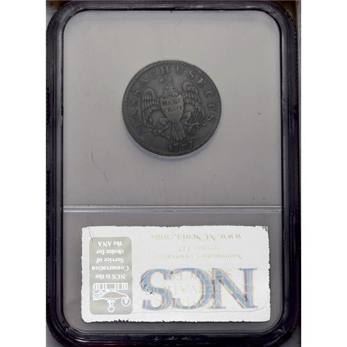 <B>1787<1/2 C> Massachusetts Half Cent--Improperly Cleaned--NCS. AU Details.</B></I> Ryder 4-C, R.2. Perhaps recolored at one time, but since retoned dark brown. The color does not appear unnatural, and the devices have attractive detail. A mildly wavy example of this scarce pre-Constitution state issue. Listed on page 57 of the 2006 <I>Guide Book.</B></I>