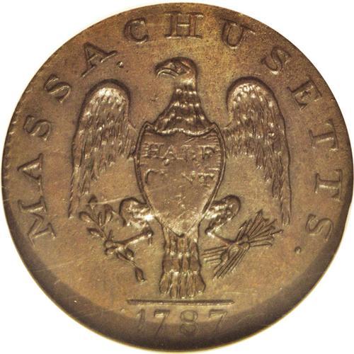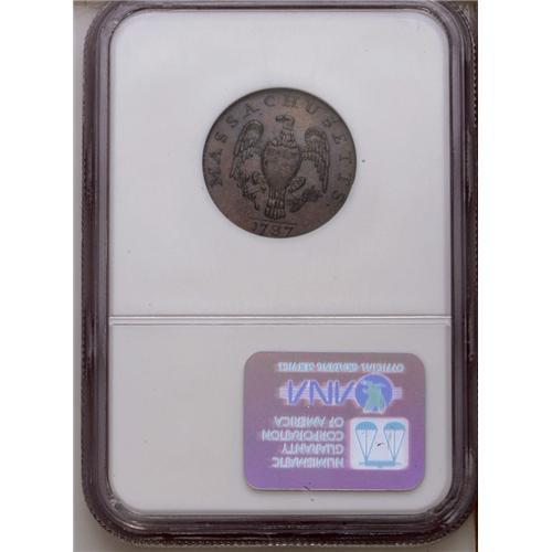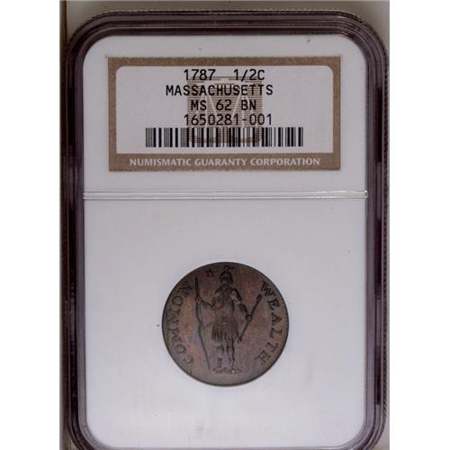 <B>1787<1/2 C> Massachusetts Half Cent MS62 Brown NGC.</B></I> Ryder 1-D, R.4. Pleasing olive-brown surfaces with some traces of iridescent luster, and possibly within the Condition Census for this scarce variety. The surfaces have a slightly matte appearance with traces of hard, old corrosion on each side. A few faint hairline scratches can be seen at the lower right part of the obverse. The centers are extremely soft, similar to lot 63 in part V of the Ford Collection. Listed on page 57 of the 2007 <I>Guide Book.</B></I>