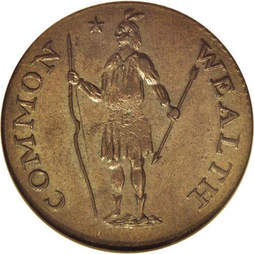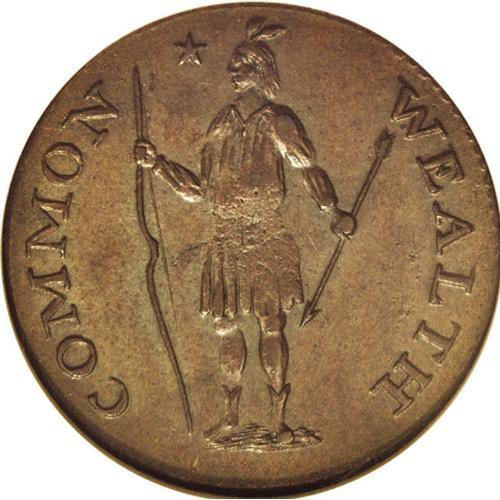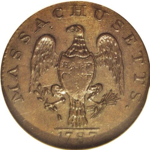 <B>1787<1/2 C> Massachusetts Half Cent MS62 Brown NGC.</B></I> Ryder 1-D, R.4. Pleasing olive-brown surfaces with some traces of iridescent luster, and possibly within the Condition Census for this scarce variety. The surfaces have a slightly matte appearance with traces of hard, old corrosion on each side. A few faint hairline scratches can be seen at the lower right part of the obverse. The centers are extremely soft, similar to lot 63 in part V of the Ford Collection. Listed on page 57 of the 2007 <I>Guide Book.</B></I>