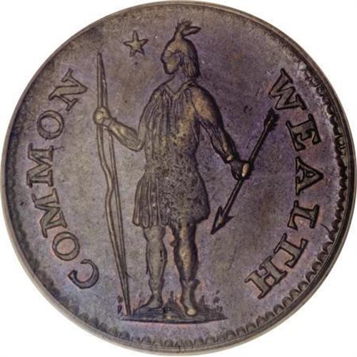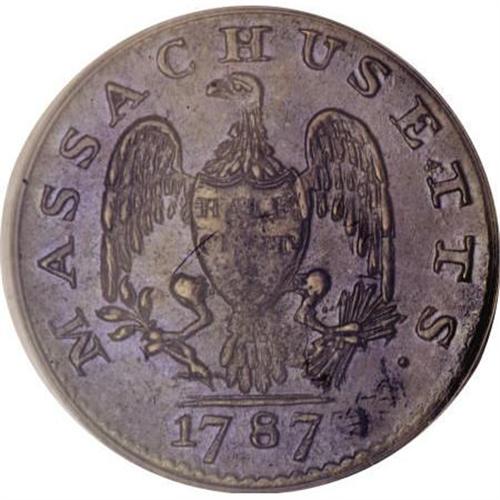 <B>1787 1/2 C Massachusetts Half Cent MS63 Brown PCGS.</B></I> Ryder 5-A, R.3. Generally medium brown, although glimpses of faded red emerge from the legends. Nicely struck overall with moderate incompleteness near the centers. A loupe reveals an occasional subdued thin field mark. Listed on page 57 of the 2008 <I>Guide Book</B></I>. Population: 17 in 63, 27 finer (1/08).<BR><BR><b>Shipping:</b> Coins & Currency (<a target="_blank" href="http://www.heritageauctions.com/common/shipping.php">view shipping information</a>)