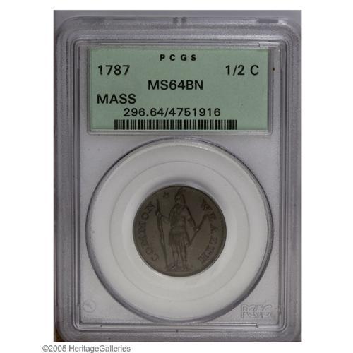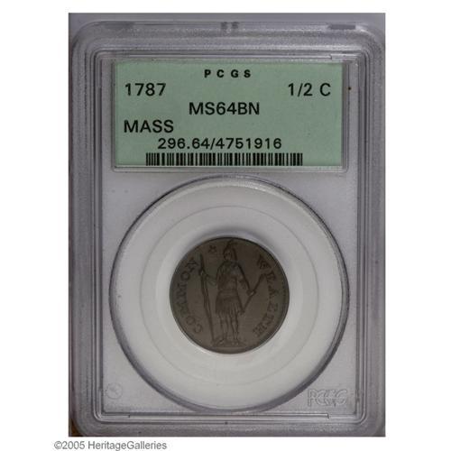 <B>1787<1/2 C> Massachusetts Half Cent MS64 Brown PCGS.</B></I> Ryder 4-C, R.2. A crisply struck dark brown near-Gem, remarkably void of contact or corrosion. A minor diagonal planchet streak (as made) on the Indian's chest is mentioned as a pedigree marker. In a green label PCGS holder. An opportunity for the alert Early American specialist. Listed on page 57 of the 2006 <I>Guide Book.</B></I>