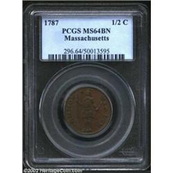 1787 1/2 C Massachusetts Half Cent MS64 Brown PCGS. Ryder 4-C. This is a richly toned, mostly medium