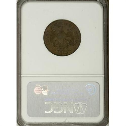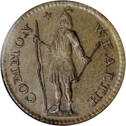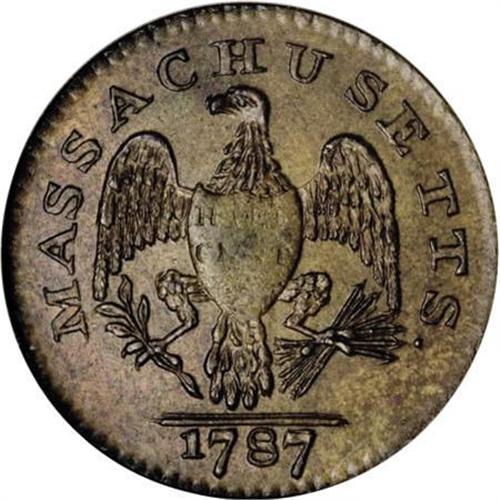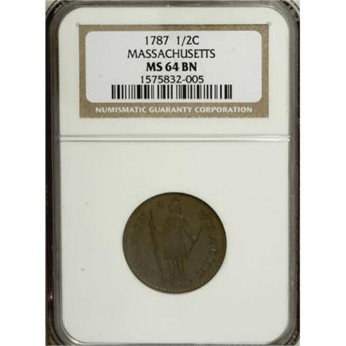 <B>1787 1/2 C Massachusetts Half Cent MS64 Brown NGC.</B></I> Ryder 4-B, R.5. The eagle's doubled beak is diagnostic for this better die marriage. Olive toning dominates the obverse, while the reverse is golden-brown. The strike is sharp except for moderate softness in the centers. The fields are remarkably unabraded. Listed on page 57 of the 2008 <I>Guide Book.</B></I><BR><BR><b>Shipping:</b> Coins & Currency (<a target="_blank" href="http://www.heritageauctions.com/common/shipping.php">view shipping information</a>)