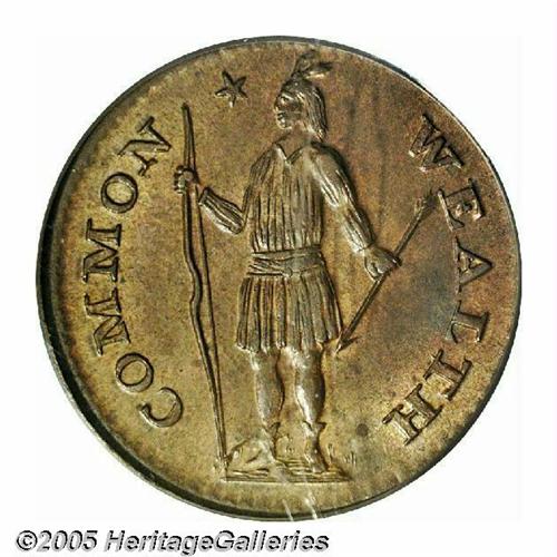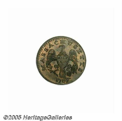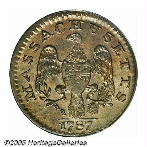 <B>1787<1/2 C> Massachusetts Half Cent MS65 Brown PCGS.</B></I> Ryder 4-C, R.2. The M in MASSACHUSETTS is recut. A simply beautiful coin with nice surfaces and detail. Even metal flow lines are visible under magnification and faint traces of red can still be faintly made out around the devices. Great for either a type collection or as an example of the variety for a specialist. Listed on page 45 of the 2005 <I>Guide Book.</B></I> <BR><I>From The Melrose Bay Collection.</B></I>
