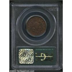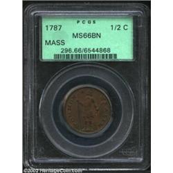 1787 1/2 C Massachusetts Half Cent MS66 Brown PCGS. Ryder 4-C. This is an extraordinarily well preserved representative of this otherwise easily obtainable die marriage. In fact, it is finer than the Uncirculated example that sold as lot 2111 in Bowers and Merena's March 1987 sale of the Frederick B. Taylor Collection. (That coin was graded Uncirculated MS-60 in the catalog, and the photo reveals a prominent spot in the left obverse field.) The present coin displays rich orange-brown toning over powerfully impressed and sharply detailed central devices. The denticles are not complete in all areas around the peripheries--a minor complaint for the type. There is not a single bothersome abrasion, and accuracy alone compels us to mention a well concealed reverse spot in the eagle's right (facing) wing feathers. One could hardly do better than to select this Gem to represent the 1787 Massachusetts Half Cent in their type collection. Listed on page 39 of the 2003 Guide Book. Population: 3 in 66 Brown, none are finer with this color designation (10/02). Important notice: We expect to be auctioning lots at the rate of 200-250 per hour. Sometimes eBay Premier live bid software cannot keep up with that pace, so we strongly recommend that you place a realistic proxy bid now as insurance to avoid disappointment. Also please note that all Heritage/CAA lots purchased through eBay Premier carry a 20% Buyer's Premium. Please make sure you read the Terms and Conditions.