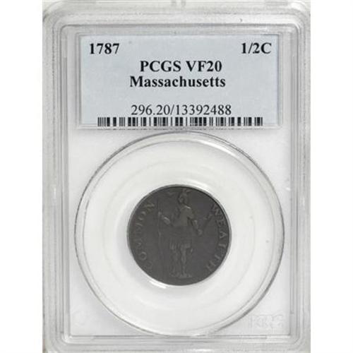<B>1787 1/2 C Massachusetts Half Cent VF20 PCGS.</B></I> PCGS Population (7/197). NGC Census: (0/0). (#296)<BR><BR><b>Shipping:</b> Coins & Currency (<a target="_blank" href="http://www.heritageauctions.com/common/shipping.php">view shipping information</a>)
