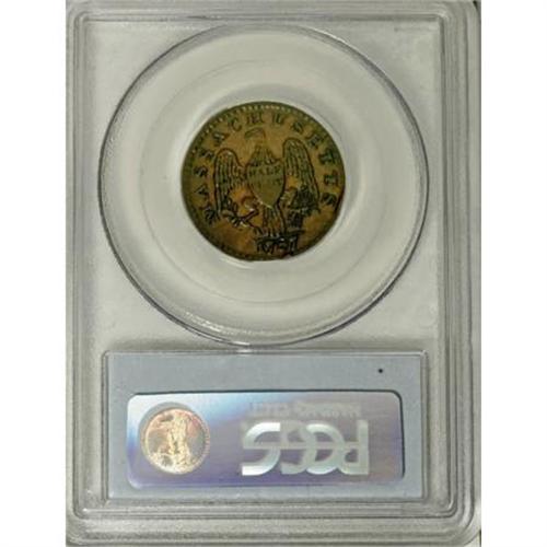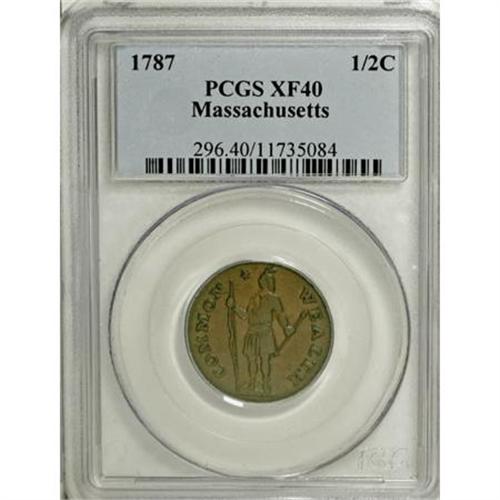 <B>1787 1/2 C Massachusetts Half Cent XF40 PCGS.</B></I> Ryder 4-C, R.2. Generally medium brown, although lighter golden-brown on the reverse field. The eagle's shield and the Indian's attire exhibit wear, but HALF CENT is easily legible. Minor build-up accompanies design recesses. A mint-made 2% curved clip at 12 o'clock is largely obscured by the holder. Listed on page 57 of the 2008 Guide Book.<BR><BR><b>Shipping:</b> Coins & Currency (<a target="_blank" href="http://www.heritageauctions.com/common/shipping.php">view shipping information</a>)