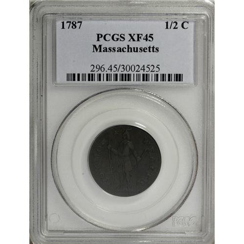 <B>1787 1/2 C Massachusetts Half Cent XF45 PCGS.</B></I> Ryder 4-C, R.2. A deep brown piece with a faint but fully legible HALF CENT. All other legends are bold. Moderate build-up is present, and close examination locates a few old scratches. Listed on page 57 of the 2007 <I>Guide Book.</B></I><BR><I>From The Cocoa Beach Collection.</B></I><BR><BR><b>Shipping:</b> Coin/Currency (<a target="_blank" href="http://www.heritageauctions.com/common/shipping.php">view shipping information</a>)