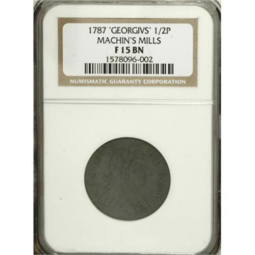 <B>1787 1/2P 'GEORGIVS' Machin's Mills Halfpenny F15 NGC.</B></I> NGC Census: (0/0). PCGS Population (4/50). (#469)<BR><BR><b>Shipping:</b> Coins & Currency (<a target="_blank" href="http://www.heritageauctions.com/common/shipping.php">view shipping information</a>)