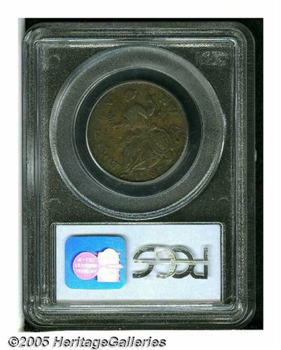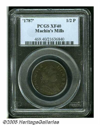 <B>1787<1/2P> Machin's Mills Halfpenny XF40 PCGS.</B></I> Vlack 19-87C, R.2. A glossy mahogany-brown example, quite sharp for the issue. The obverse is perfectly centered, the reverse is a couple of degrees off center toward 1 o'clock although all legends are complete. A few old, moderate handling marks are concealed by the original toning. Listed on page 54 of the 2005 <I>Guide Book.</B></I>