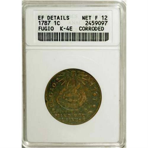 <B>1787 1C Fugio Cent, Club Rays, Rounded Ends--Corroded--ANACS. XF Details, Net F12.</B></I> N.4E. NGC Census: (0/0). PCGS Population (4/70). (#904)<BR><BR><b>Shipping:</b> Coins & Currency (<a target="_blank" href="http://www.heritageauctions.com/common/shipping.php">view shipping information</a>)