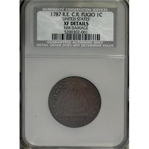 <B>1787 1C Fugio Cent, Club Rays, Rounded Ends--Rim Damage--NCS. XF Details.</B></I> Newman 3-D, R.3. The reverse border between 6 and 9 o'clock has a dull scratch, but most collectors will instead concentrate on the smooth and slightly glossy golden-brown fields and devices. MIND YOUR BUSINESS and most other legends are bold. Listed on page 84 of the 2008 <I>Guide Book.</B></I><BR><BR><b>Shipping:</b> Coins & Currency (<a target="_blank" href="http://www.heritageauctions.com/common/shipping.php">view shipping information</a>)