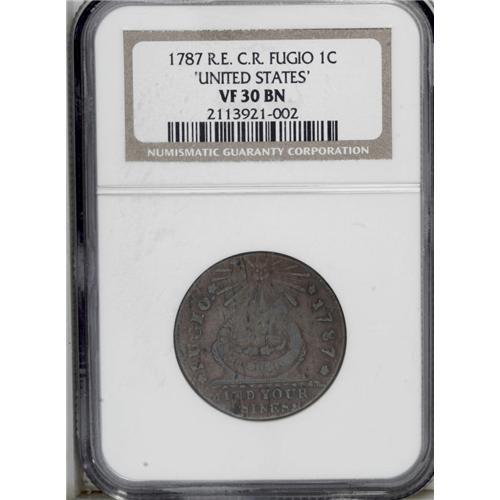 1787 1C Fugio Cent, Club Rays, Rounded Ends VF30 NGC.