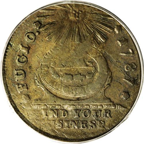 <B>1787<1C> Fugio Cent, Club Rays, Rounded Ends VF30 PCGS.</B></I> Newman 3-D, R.3. The I in MIND is entered high, and the label border below UNITED STATES is greatly attenuated from die polish. The scarcer of only two Club Rays, Rounded Ends varieties. This chestnut-brown example shows a couple of notable planchet flakes on each side. Struck from clashed dies.