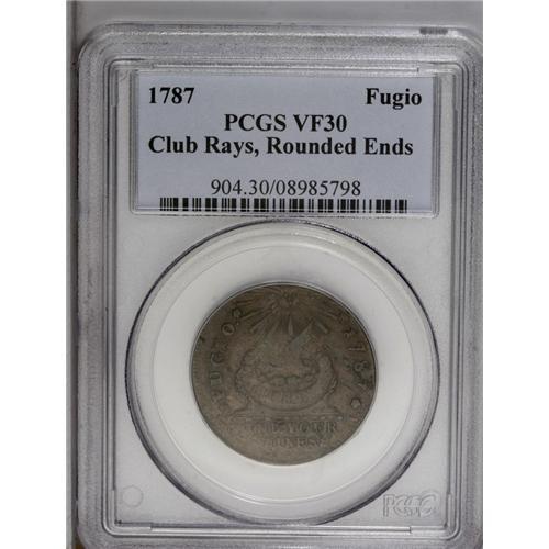 1787 1C Fugio Cent, Club Rays, Rounded Ends VF30 PCGS.