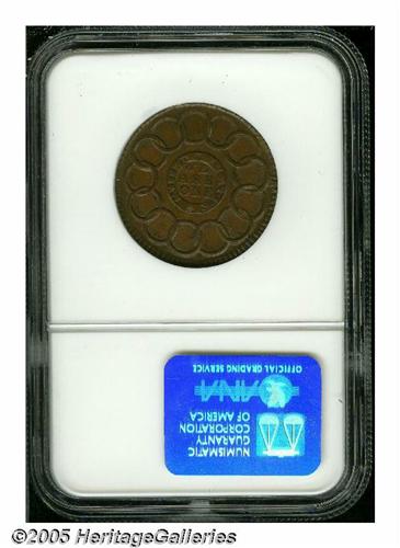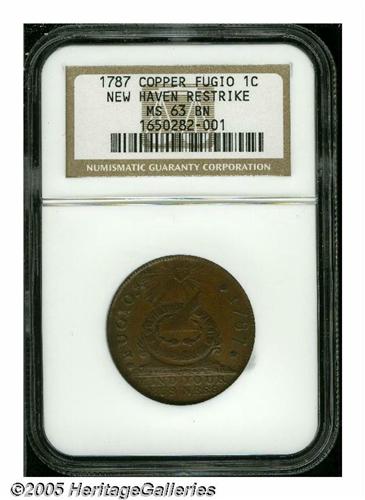 <B>1787<1C> Fugio Cent, New Haven Restrike, Copper MS63 Brown NGC.</B></I> Newman 104-FF. A splendid golden-brown example of this interesting and collectible 19th century copy. A late die state with breaks on the F and O in FUGIO. Listed on page 70 of the 2005 <I>Guide Book.</B></I>