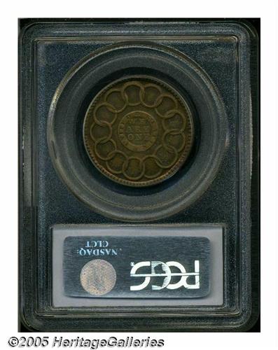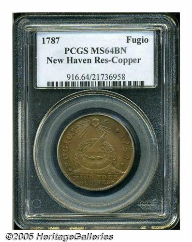 <B>1787<1C> Fugio Cent, New Haven Restrike, Copper MS64 Brown PCGS.</B></I> Newman 104-FF. Although designated as Brown by PCGS, ample bright gold color clings to the borders of this otherwise tan-brown piece. A very attractive example of this early copy. Listed on page 70 of the 2005 <I>Guide Book.</B></I>