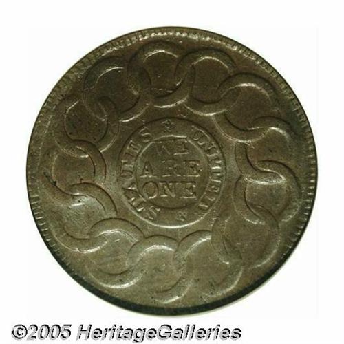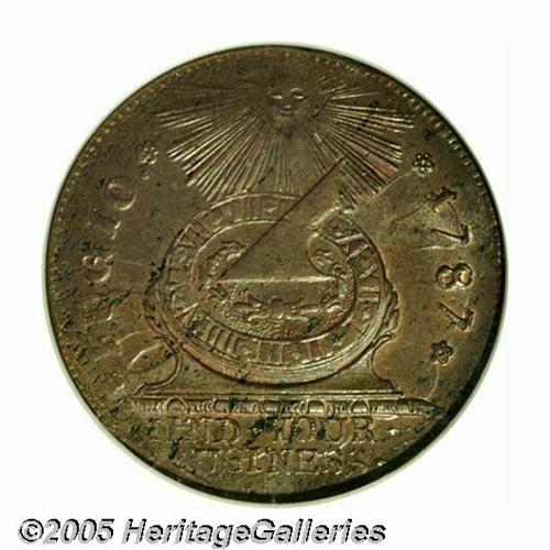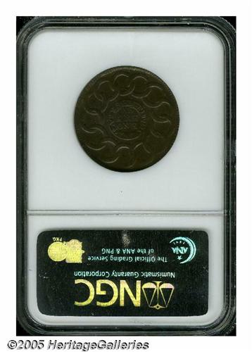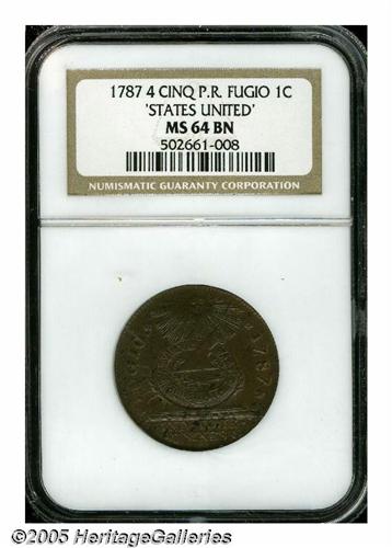 <B>1787<1C> Fugio Cent, STATES UNITED, 4 Cinquefoils MS64 Brown NGC.</B></I> Newman 13-X, R.1. A more obtainable variety that was well represented in the Bank of New York hoard. This is an attractive Mint State representative whose otherwise medium brown color yields to faint red and/or orange tinting in the most protected areas of the obverse. Nearly diagnostic clashmarks are noted in the fields and minor planchet roughness is found along the left obverse periphery. Listed on page 69 of the 2005 <I>Guide Book.</B></I>