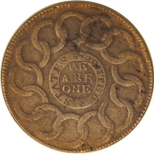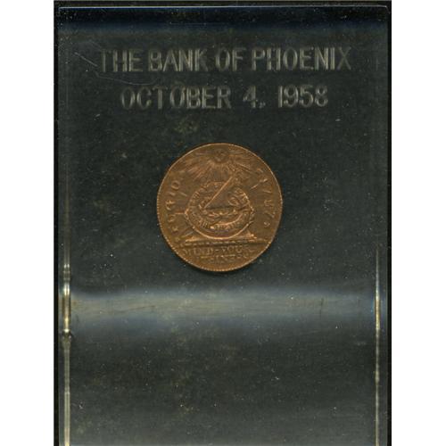<B>1787<1C> Fugio Cent, STATES UNITED, Cinquefoils AU50 Uncertified.</B></I> Newman 13-X, R.1. All of the details are strong, yet this piece has been cleaned and now has light orange surfaces. It is embedded in a 2.75" x 3.75" x 1" clear lucite holder. The bottom of the holder is lettered "The Bank of New York, Founded 1784" and the back is lettered (reading from the front) "The Bank of Phoenix October 4, 1958."
