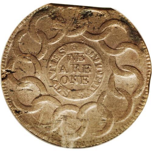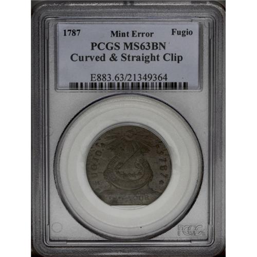 <B>1787<1C> Fugio Cent, STATES UNITED, Cinquefoils--Curved and Straight Clip--MS63 Brown PCGS.</B></I> Newman 13-X, R.1. Medium olive-brown surfaces with darker ebony toning streaks, and with traces of original red color still visible. This is struck on a double clipped planchet with a straight clip at 6 o'clock and a smaller curved clip at 3 o'clock. In addition, the reverse has a tiny planchet flaw on the border at 9 o'clock. <BR><BR><B>Important notice:</B> Heritage usually auctions material at the rate of 200-250 lots per hour. On some occasions eBay Live bid software or the Internet may not be able to keep up with the pace of the auction. We recommend placing a realistic absentee bid now as insurance to avoid disappointment. Occasionally the auctioneer may eliminate or reject an eBay Live bid, and the auctioneer may also reopen a lot after the close of the eBay live bidding (usually because we missed an audience bid), and may reject your bid even if it shows you as the winning bidder. By bidding via eBay Live, you agree that Heritage may award the lot to another bidder at its sole discretion under the circumstances described above or any other reasonable circumstances. Since eBay bids are not shown to us until we open the lot on the floor, we treat those bids just like floor bids. In most cases the floor responds before the eBay bid is presented to us, due to Internet lag time, so for consistency we have made it a policy that floor bids are always considered first over tie eBay live bids. Also please note that all Heritage lots purchased through eBay Live carry a 20% Buyer's Premium. Please make sure you read the Terms and Conditions before you bid. This lot is being auctioned in conjunction with a live floor auction by Heritage Galleries & Auctioneers. All final auction and invoice information will be supplied by Heritage Galleries & Auctioneers, and all other information should be considered preliminary. Lot:171 <BR><BR><B>Winning Notification and Billing:</B> After the FINAL session in this auction is complete, Heritage will send e-mail and snail mail invoices. This process normally takes several days. All final auction and invoice information will be supplied by Heritage Galleries & Auctioneers, and all other information should be considered preliminary. <BR><BR>This auction will be conducted on a live auction floor and over the Internet through eBay Live. If you choose to place an absentee bid, please take a moment to <font color='#0000ff'><u><a href='http://pages.ebay.com/liveauctions/help/before/laabsentee.html'>learn how eBay Live absentee bidding works</a></u></font><font color='#000000'>