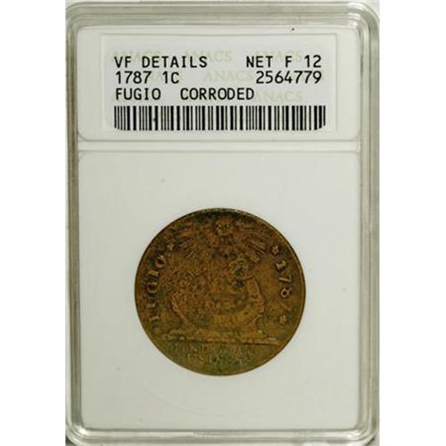 <B>1787 1C Fugio Cent, STATES UNITED, Cinquefoils--Corroded--ANACS. VF Details, Net F 12.</B></I> N.20-R. NGC Census: (0/0). PCGS Population (11/753). (#883)<BR><BR><b>Shipping:</b> Coins & Currency (<a target="_blank" href="http://www.heritageauctions.com/common/shipping.php">view shipping information</a>)