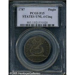 <B>1787 1C Fugio Cent, STATES UNITED, Cinquefoils Fine 15 PCGS.</B></I> Newman 12-S.1, R.5. The legends are generally sharp on this rare variety example, and the deep brown fields are only minutely granular. Each side has a couple of moderate contact marks, but this is to be expected of the grade. Listed on page 69 of the 2005 <I>Guide Book.</B></I> Lot:5062