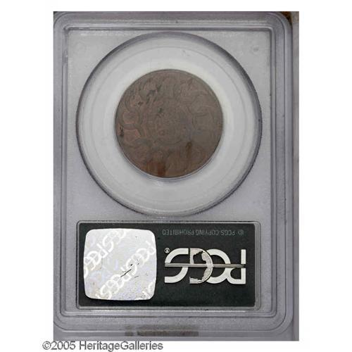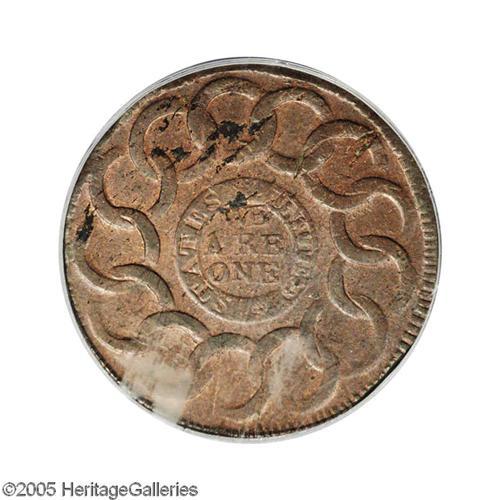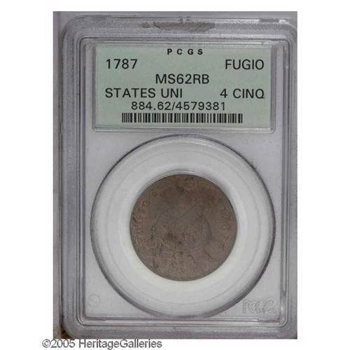 <B>1787<1C> Fugio Cent, STATES UNITED, Cinquefoils MS62 Red and Brown PCGS.</B></I> Newman 11-X, Low R.4. Significant portions of original red color shows over each side with a light accent of brown also present. A suitably struck example that is essentially unabraded, although a few shallow planchet flaws limit the grade. Many times scarcer than the Newman 13-X (Bank of New York) hoard variety. Struck from a clashed obverse die. Encapsulated in a green label holder. Listed on page 83 of the 2006 <I>Guide Book.</B></I>