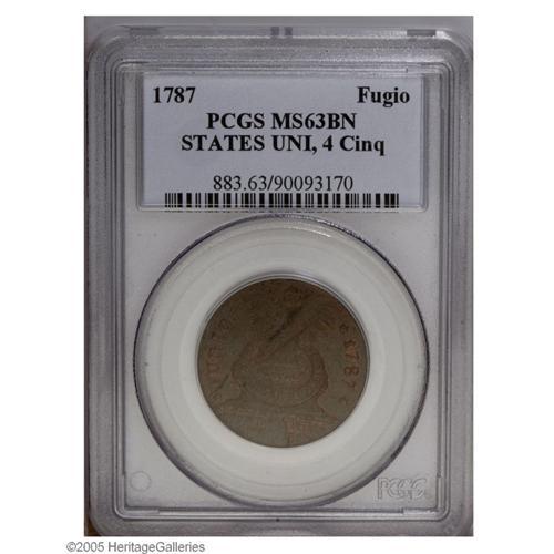 <B>1787<1C> Fugio Cent, STATES UNITED, Cinquefoils MS63 Brown PCGS.</B></I> Newman 8-X, R.1. A nicely struck olive-brown piece with ample hints of original orange-red color in protected areas. A few toned planchet flaws, as made, are typical for the type. A middle die state of this Bank of New York hoard variety, the die break on the lower obverse is prominent but does not yet obliterate much of the MIND YOUR BUSINESS legend. Listed on page 83 of the 2006 <I>Guide Book.</B></I>