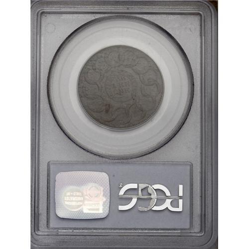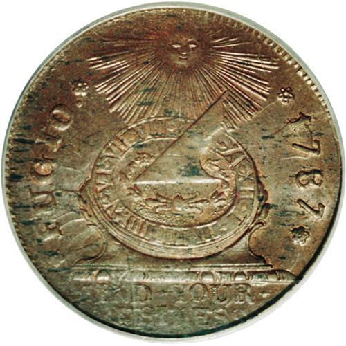 <B>1787<1C> Fugio Cent, STATES UNITED, Cinquefoils MS63 Brown PCGS.</B></I> Newman 13-X, R.1. Ebony streaks are seen on both sides of this lustrous dark brown example. Tinges of original red color can still be seen as well. This is an exciting example from the Bank of New York hoard that was discovered in the middle 19th century. <BR><BR><B>Important notice:</B> Heritage usually auctions material at the rate of 200-250 lots per hour. On some occasions eBay Live bid software or the Internet may not be able to keep up with the pace of the auction. We recommend placing a realistic absentee bid now as insurance to avoid disappointment. Occasionally the auctioneer may eliminate or reject an eBay Live bid, and the auctioneer may also reopen a lot after the close of the eBay live bidding (usually because we missed an audience bid), and may reject your bid even if it shows you as the winning bidder. By bidding via eBay Live, you agree that Heritage may award the lot to another bidder at its sole discretion under the circumstances described above or any other reasonable circumstances. Since eBay bids are not shown to us until we open the lot on the floor, we treat those bids just like floor bids. In most cases the floor responds before the eBay bid is presented to us, due to Internet lag time, so for consistency we have made it a policy that floor bids are always considered first over tie eBay live bids. Also please note that all Heritage lots purchased through eBay Live carry a 20% Buyer's Premium. Please make sure you read the Terms and Conditions before you bid. This lot is being auctioned in conjunction with a live floor auction by Heritage Galleries & Auctioneers. All final auction and invoice information will be supplied by Heritage Galleries & Auctioneers, and all other information should be considered preliminary. Lot:170 <BR><BR><B>Winning Notification and Billing:</B> After the FINAL session in this auction is complete, Heritage will send e-mail and snail mail invoices. This process normally takes several days. All final auction and invoice information will be supplied by Heritage Galleries & Auctioneers, and all other information should be considered preliminary. <BR><BR>This auction will be conducted on a live auction floor and over the Internet through eBay Live. If you choose to place an absentee bid, please take a moment to <font color='#0000ff'><u><a href='http://pages.ebay.com/liveauctions/help/before/laabsentee.html'>learn how eBay Live absentee bidding works</a></u></font><font color='#000000'>