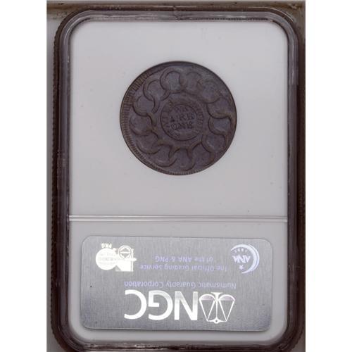 <B>1787<1C> Fugio Cent, STATES UNITED, Cinquefoils MS64 Brown NGC.</B></I> Newman 8-X, R.1. The smooth surfaces are lustrous and exhibit blended golden-brown and steel-blue toning. A middle die state, the vertical break near 6 o'clock is noticeable but does not yet engulf nearby letters. Struck a couple of degrees off center toward 3 o'clock, but all legends are intact. Listed in the 2006 edition of the <I>Guide Book</B></I> on page 83.