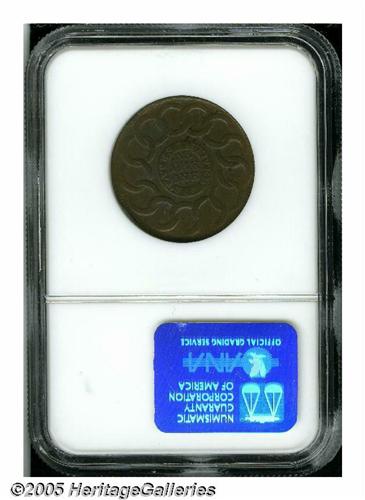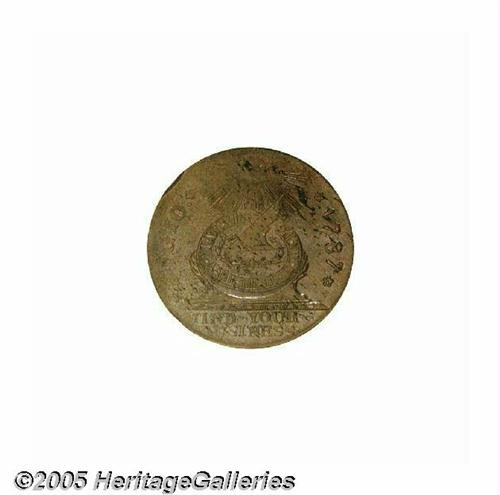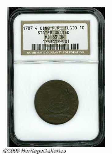 <B>1787<1C> Fugio Cent, STATES UNITED, Cinquefoils MS63 Brown PCGS.</B></I> Newman 13-X, R.3. An undisturbed golden-brown example. The surfaces are remarkably free from contact. A few mint-made planchet flaws have toned in ebony hues. A small curved clip at 10:30 is of mint origin. Struck from clashed and lightly cracked dies, as usual for the variety. Listed on page 69 of the 2005 <I>Guide Book.</B></I><BR><I>From The Melrose Bay Collection.</B></I>