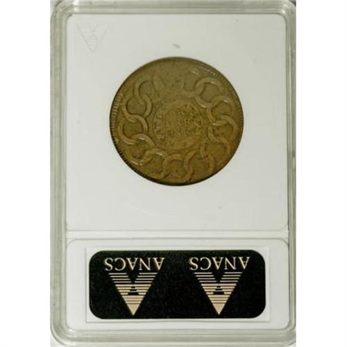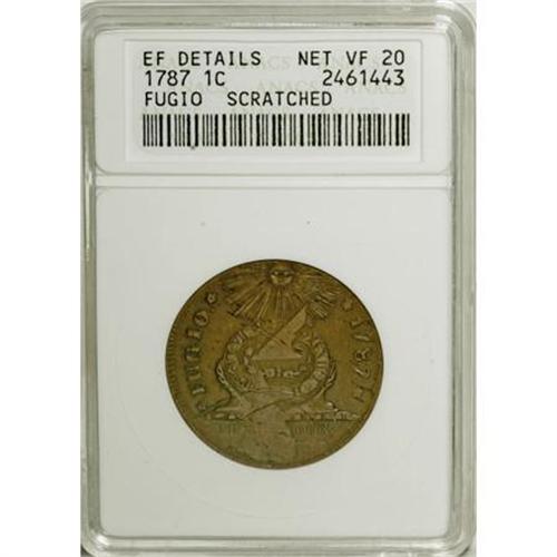 <B>1787 1C Fugio Cent, STATES UNITED, Cinquefoils--Scratched--ANACS. XF Details, Net VF20.</B></I> N.8-X NGC Census: (0/0). PCGS Population (33/695). (#883)<BR><BR><b>Shipping:</b> Coins & Currency (<a target="_blank" href="http://www.heritageauctions.com/common/shipping.php">view shipping information</a>)
