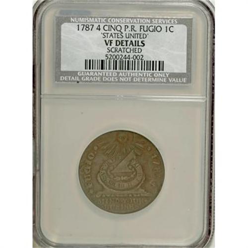 <B>1787 1C Fugio Cent, STATES UNITED, 4 Cinquefoils--Scratched--NCS. VF Details.</B></I> NGC Census: (0/0). PCGS Population (33/695). (#883)<BR><BR><b>Shipping:</b> Coins & Currency (<a target="_blank" href="http://www.heritageauctions.com/common/shipping.php">view shipping information</a>)