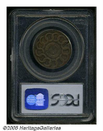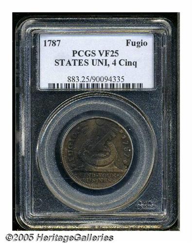 <B>1787<1C> Fugio Cent, STATES UNITED, Cinquefoils VF25 PCGS.</B></I> Newman 17-S.1, R.5. Light brown color covers the reverse and about half of the obverse, with ebony-brown toning present on the left side and center of the obverse. An edge planchet flaw at 2 o'clock on the reverse is strictly of mint origin. Generally sharp for the assigned grade. Listed on page 69 of the 2005 <I>Guide Book.</B></I>