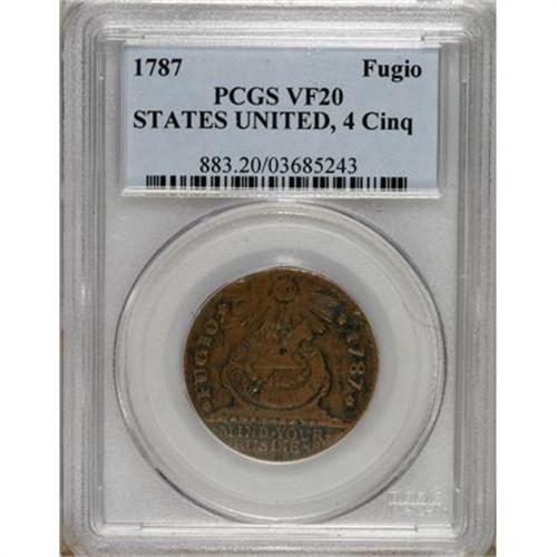 <B>1787 1C Fugio Cent, STATES UNITED, Cinquefoils VF20 PCGS.</B></I> Newman 12-M.1, R.4. A scarce die marriage. Richly detailed for the grade, particularly on MIND YOUR BUSINESS and the left side of the sundial. The centers have minor planchet flaws, and a small depression is noted at 2 o'clock on the obverse. Struck from clashed dies. Listed on page 83 of the 2008 <I>Guide Book.</B></I><BR><BR><b>Shipping:</b> Coins & Currency (<a target="_blank" href="http://www.heritageauctions.com/common/shipping.php">view shipping information</a>)