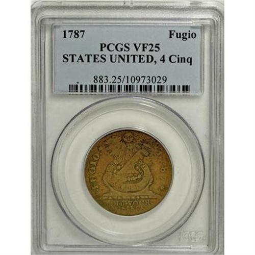 <B>1787 1C Fugio Cent, STATES UNITED, Cinquefoils VF25 PCGS.</B></I> Newman 7-T, R.5. A moderately circulated nutmeg-brown example of this elusive Fugio cent variety, distinguished by an irregular punching of BUSINESS that puts the N close to the Y and O of YOUR. Mildly marked overall, though a significant planchet void is noted near 7 o'clock at the reverse rim. Listed on page 83 of the 2008 <I>Guide Book</B></I>.<BR><I>From The Beau Clerc Collection.</B></I><BR><BR><b>Shipping:</b> Coins & Currency (<a target="_blank" href="http://www.heritageauctions.com/common/shipping.php">view shipping information</a>)